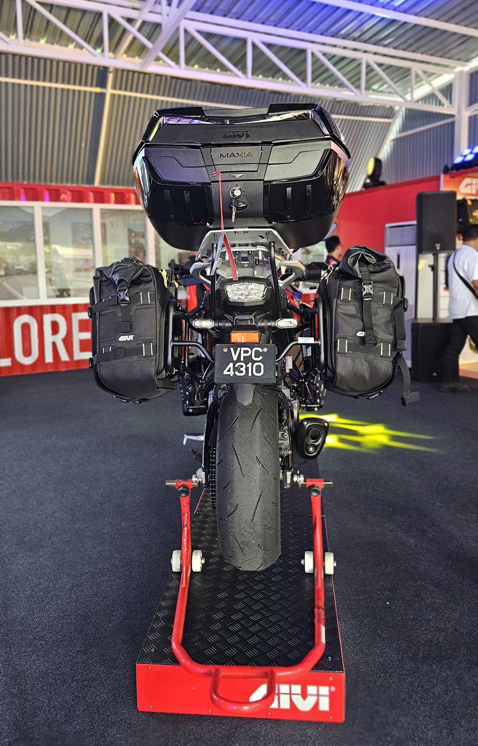 Xe trưng bày gắn đầy đủ thùng và túi Givi, mô phỏng setup thực tế khi đi touring