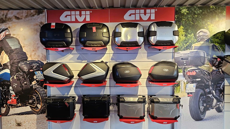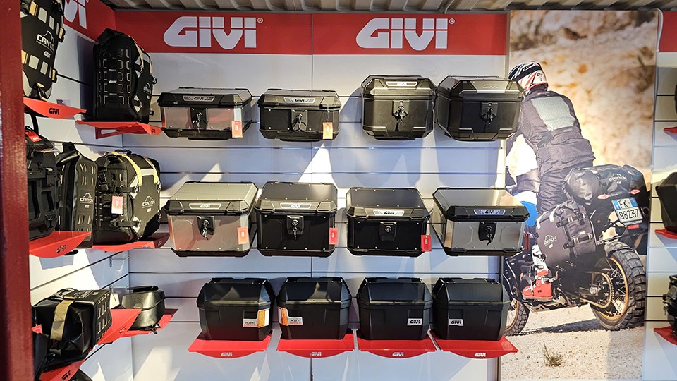 Khu vực trưng bày thùng nhôm Givi dành cho xe adventure và touring đường dài