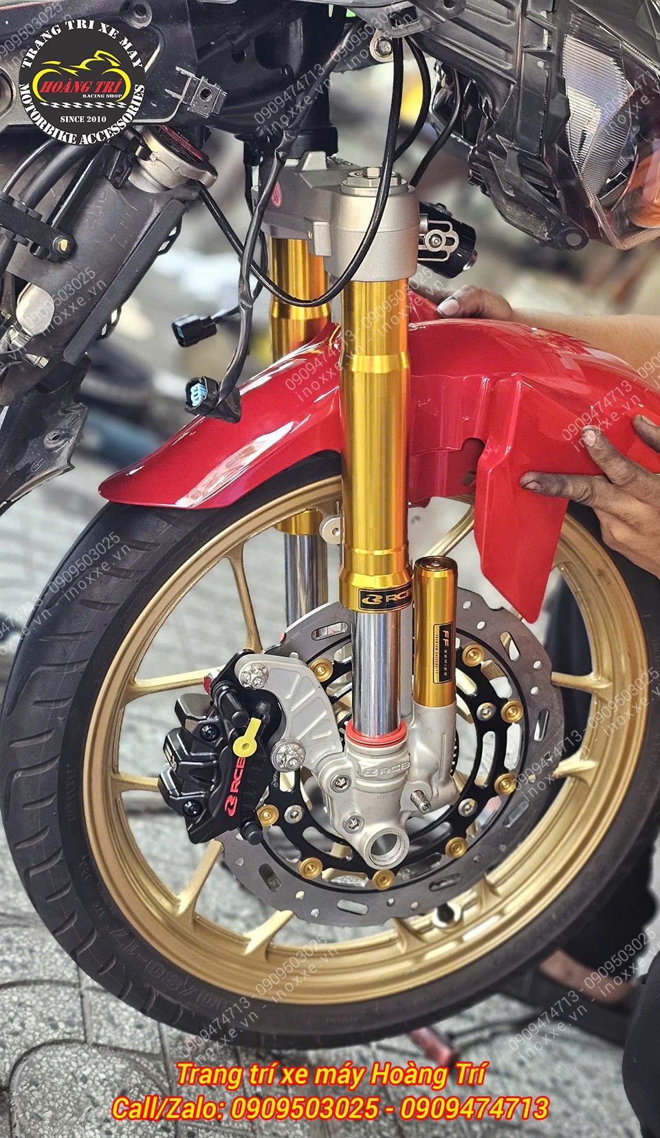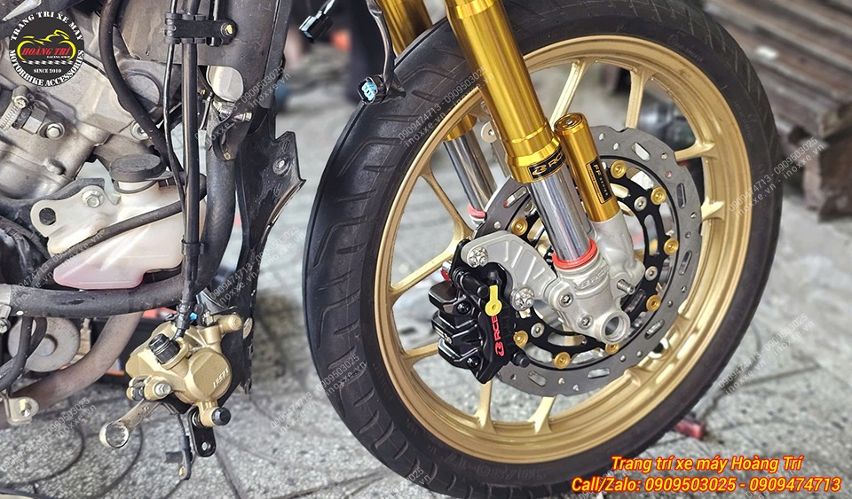 Góc chi tiết bánh trước với combo đĩa lớn, heo dầu RCB và phuộc vàng USD RCB nổi bật