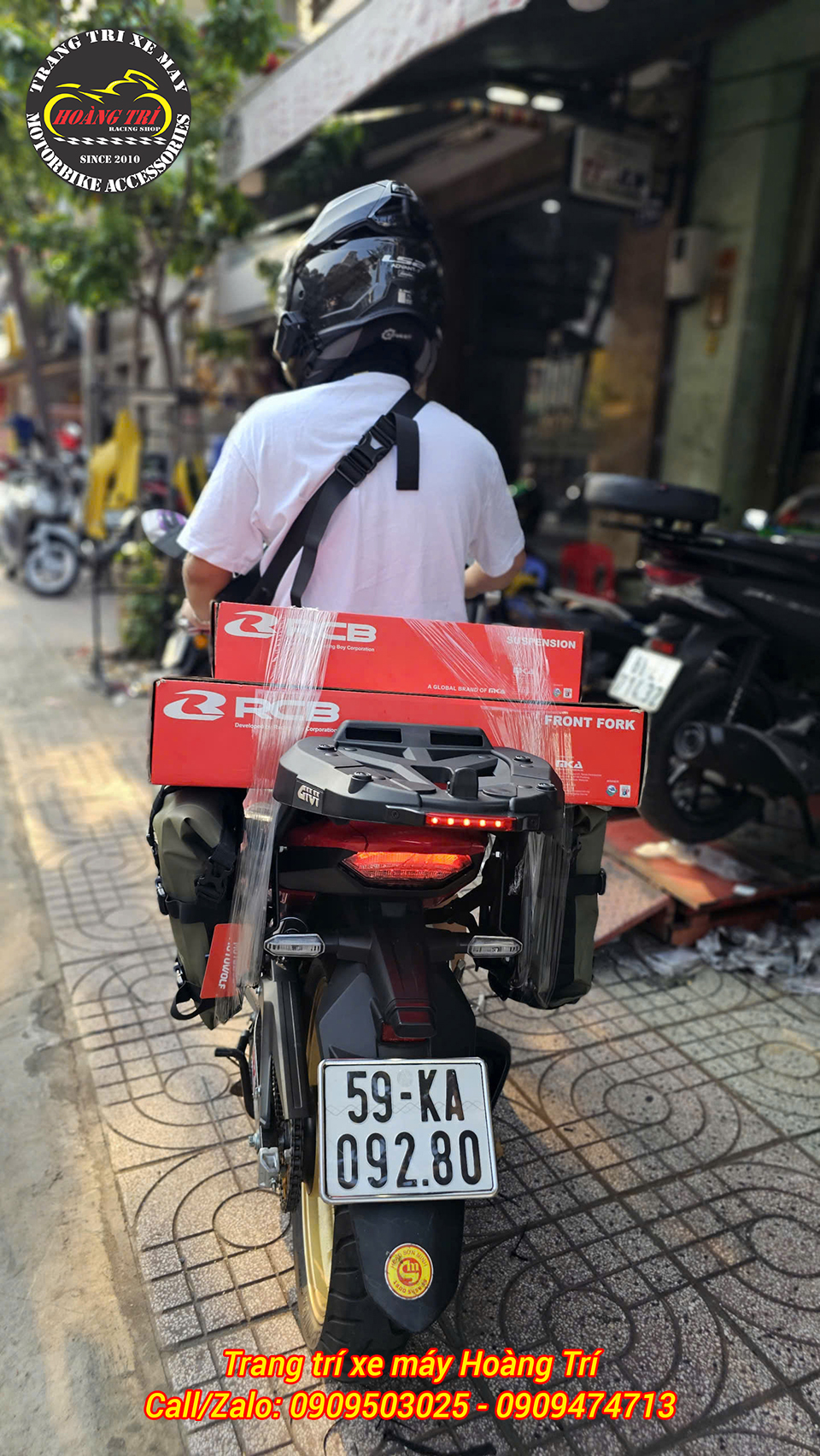 Tổng thể xe hoàn thiện với baga Givi và phuộc RCB mang phong cách thể thao mạnh mẽ