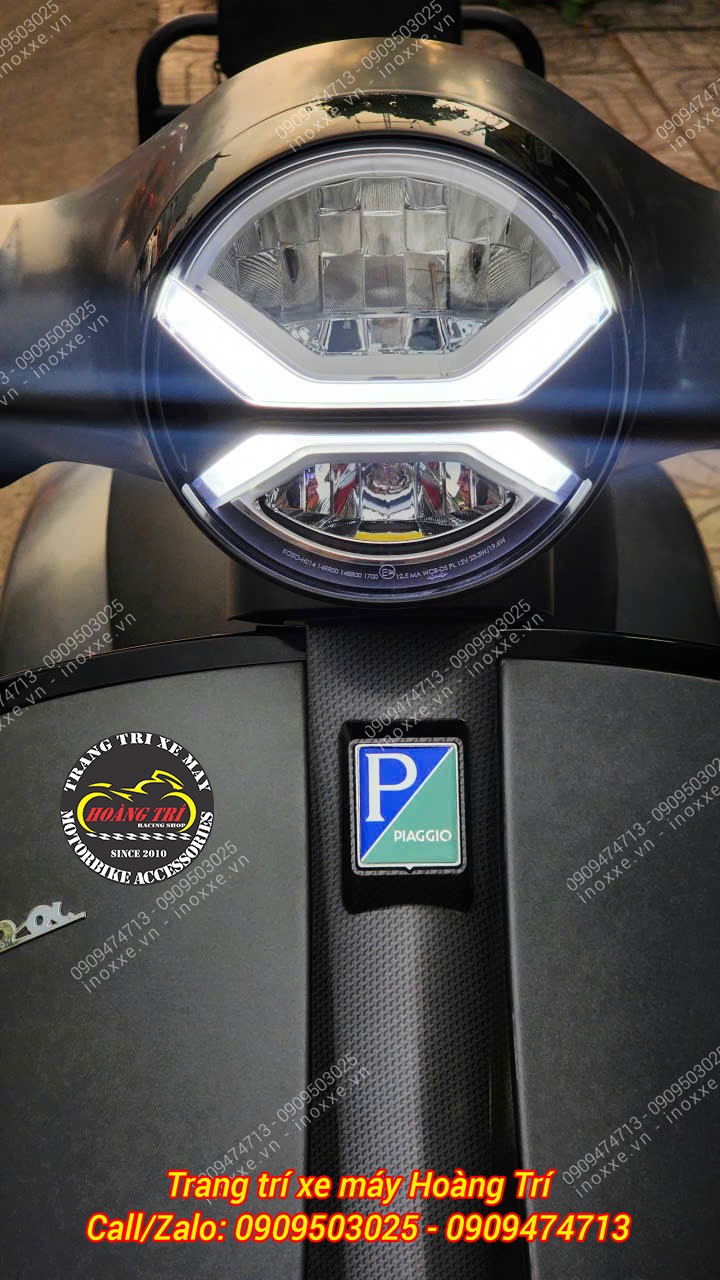 Cận cảnh đèn pha KOSO Vespa GTS với dải LED định vị chữ X nổi bật