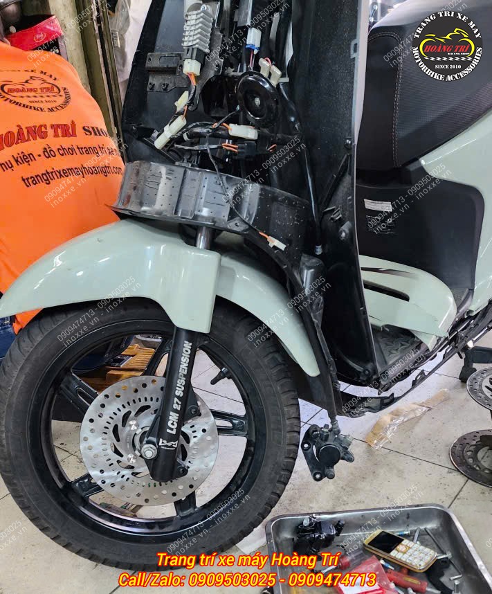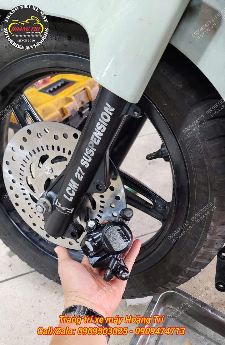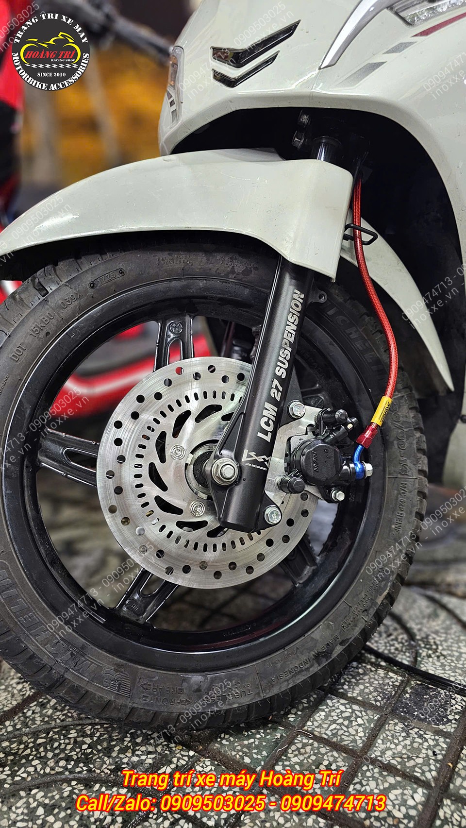 Cụm bánh trước hoàn thiện với phuộc LCM, đĩa zin và dây dầu độ tăng độ an toàn tối đa