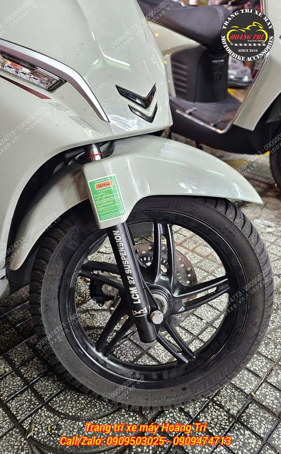 Tổng thể bánh trước Feliz sau khi nâng cấp phuộc LCM, giữ dáng xe nhưng cứng cáp hơn