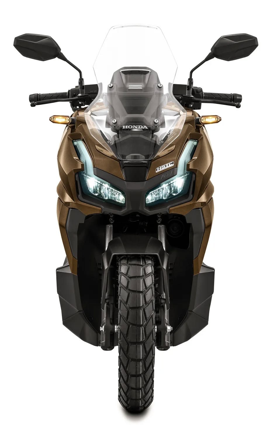 Góc trực diện phần đầu ADV 160 màu nâu với kính chắn gió cao và cụm đèn pha siêu sáng