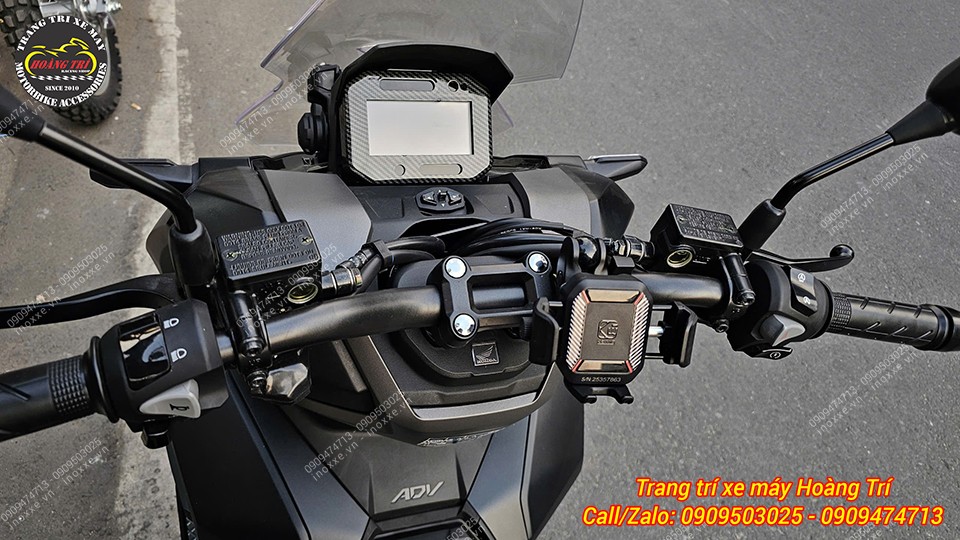 Cận cảnh hai phụ kiện gồm ốp đồng hồ carbon và giá đỡ điện thoại gắn trên tay lái ADV 160