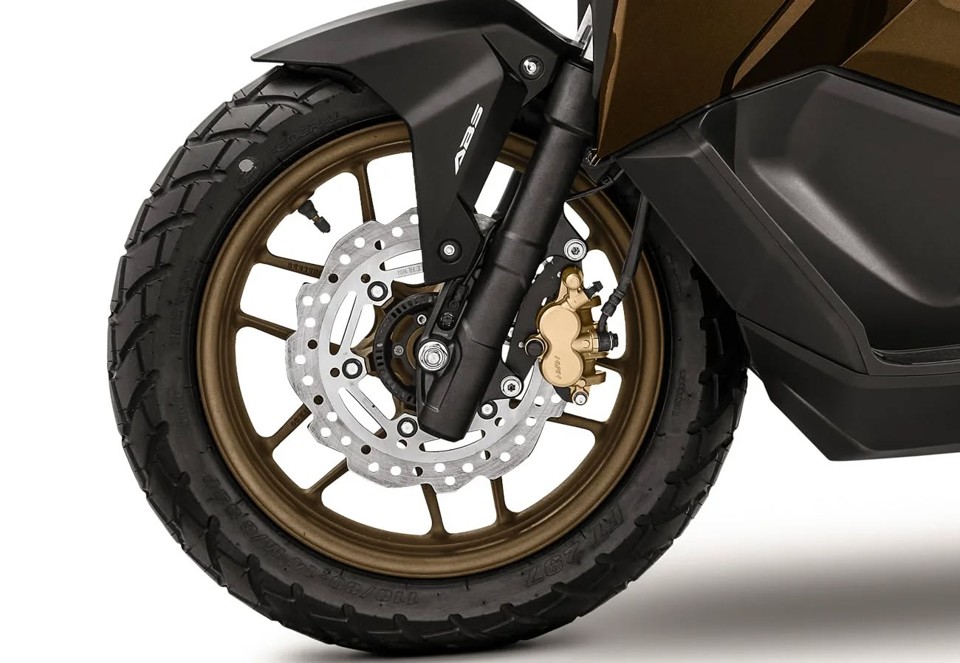 Bánh trước ADV 160 với phanh đĩa ABS, mâm đồng và lốp gai địa hình nhìn cận cảnh
